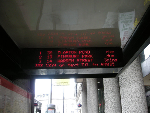 それから、ロンドンにも全部のバス停ではないけど、地下鉄みたいに電光掲示板で次に何のバスが大体何分後に来るかというのがわかるようになってるんだ・け・ど。これも信じてはイケマセン。ほとんど当てにならないからね。だったら設置してる意味ないじゃん。って、まさにその通りなんだけど。でも、極たまにその通りに来る場合もあるから。まぁ何ですか、占いみたいに当たるも八卦、当たらぬも八卦って感じで50:50くらいに考えればいいんじゃないかなぁと(苦笑) すげーいい加減だよねー…。